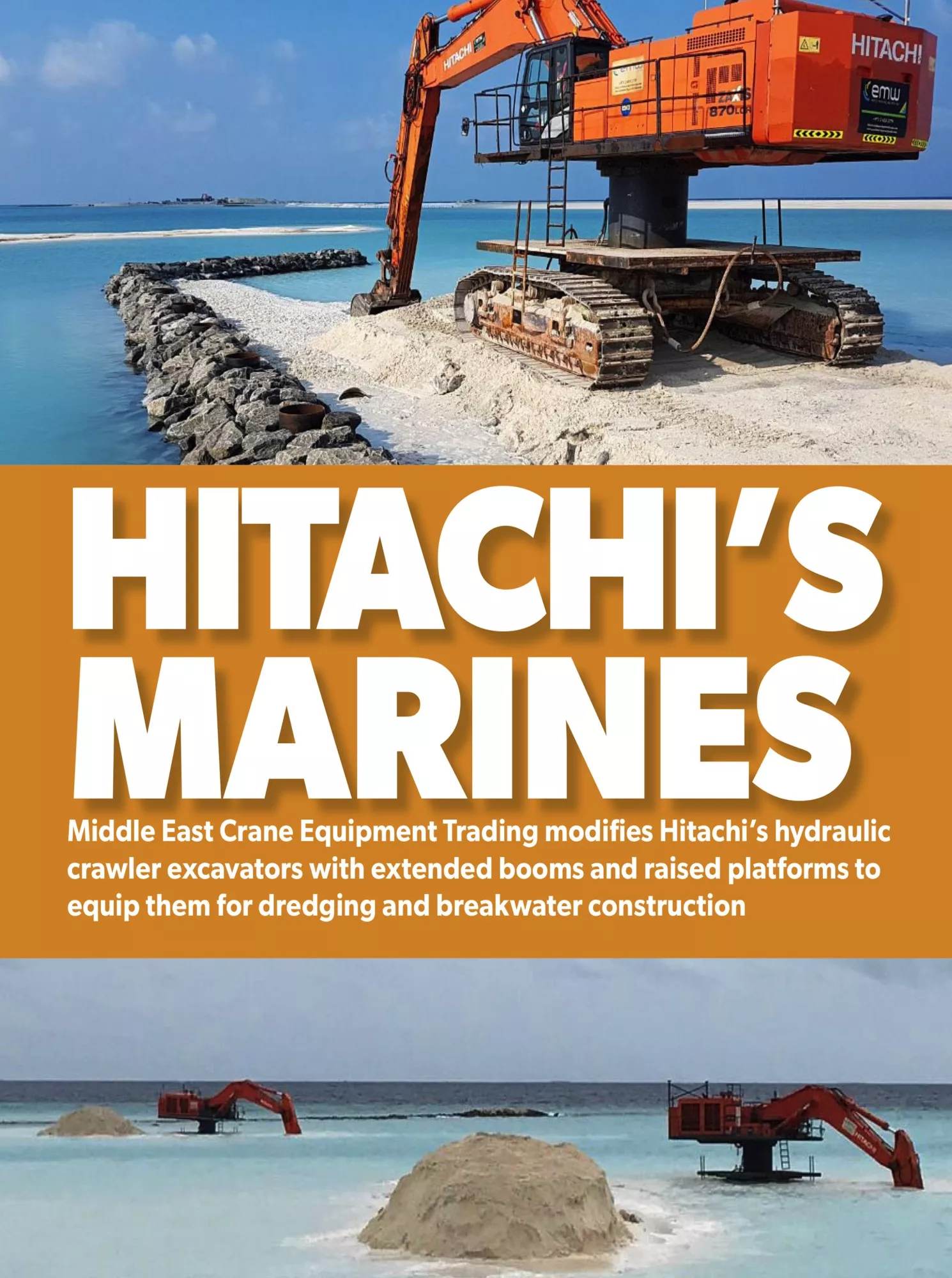 Sunday, September 8, 2019Middle East Crane Equipment trading modifies Hitachi's hydraulic crawler excavators with extended booms and raised platforms to equip them for dredging and breakwater construction.