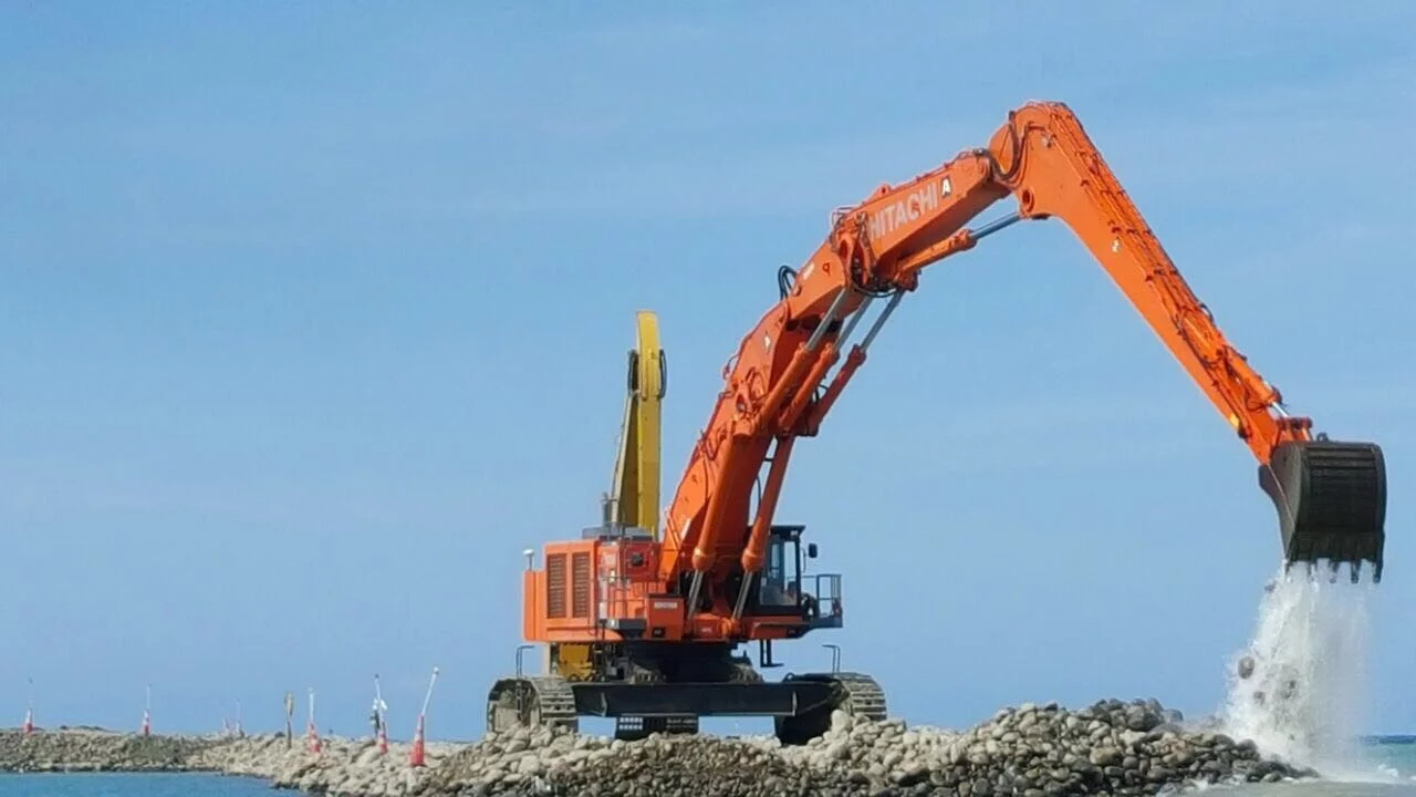 Un jobsite impressionant avec 2 machines EX1900 et 3 machines EX1200, toutes équipées de Super Long Fronts jusqu'à 40 mètres.
