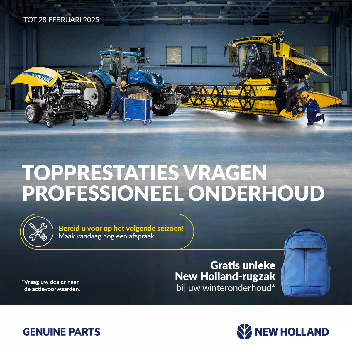Une touche sympathique : lors d'un entretien cet hiver, vous recevrez gratuitement un sac à dos New Holland exclusif, disponible uniquement pendant notre promotion hivernale !