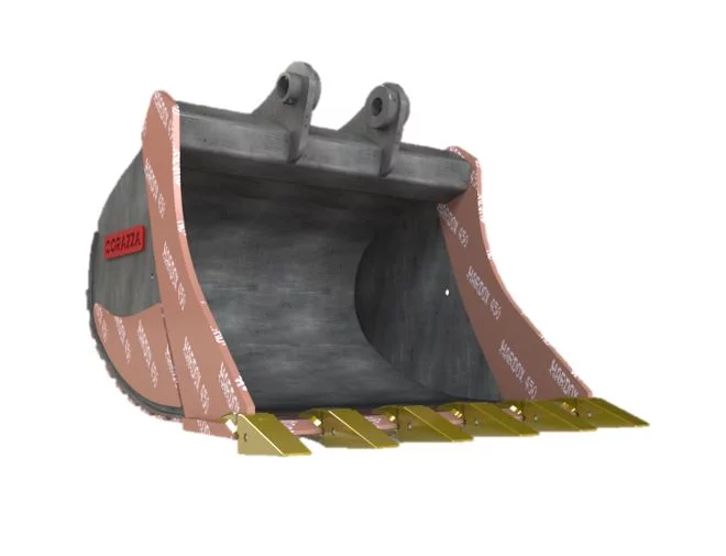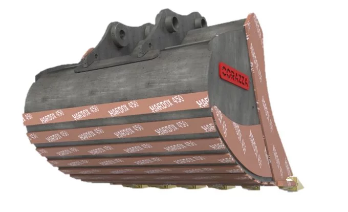 De Standaard Heavy-duty bakken van Corazza zijn geschikt voor het verwerken van materialen met een dichtheid hoger dan 1,8 t/m³. De bodem, verstevigingen en snijranden aan de voor- en zijkant zijn vervaardigd uit HARDOX® 450 en HARDOX® 500 TUF, wat zorgt voor een uitzonderlijke slijtvastheid en een lange levensduur, zelfs onder de meest veeleisende omstandigheden.