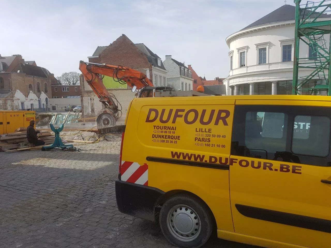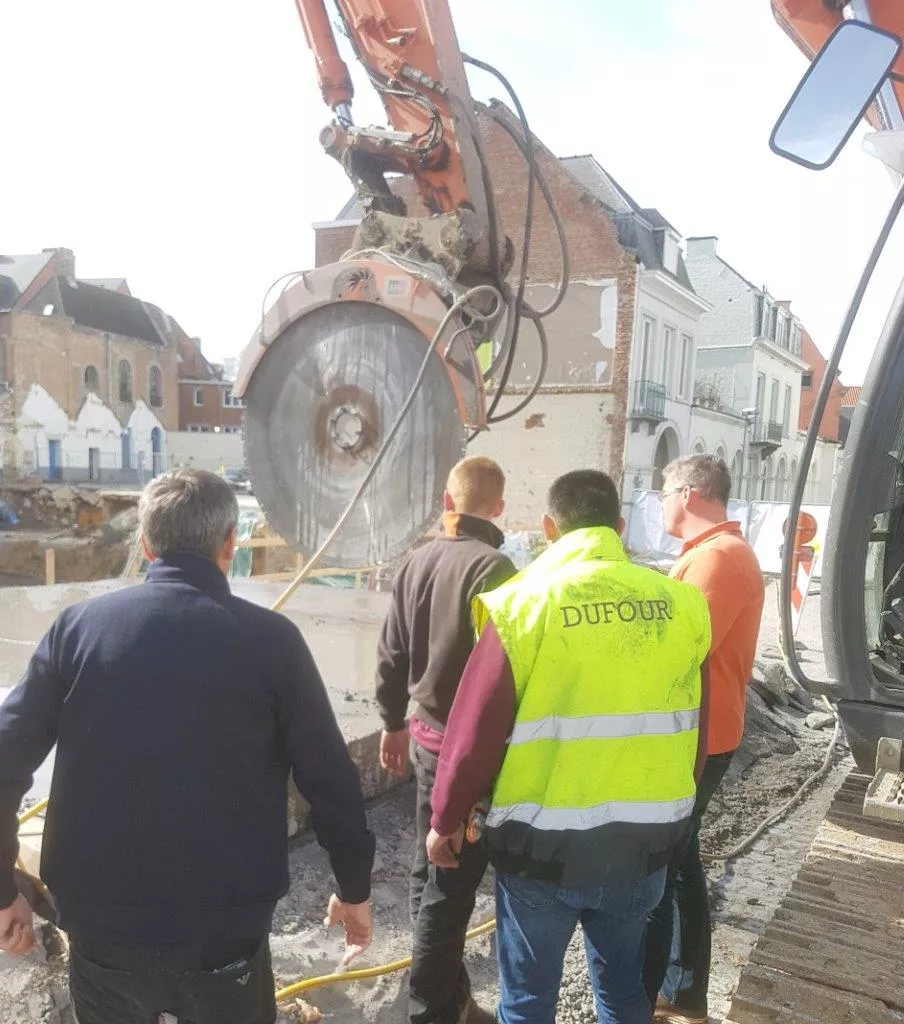 woensdag 11 april 2018In het centrum van Doornik werd door Dufour een gewapende betonnen fundatie van 150 m³ met een beton zaagmachine gesloopt.
