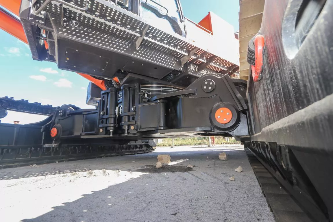 Seveijns: ‘Dat werkt lekker door en met de vaste pennen kan er nooit iets gebeuren.’ Tamelijk uniek is de onderwagen van de KMC 1200S. Deze is niet uitschuifbaar maar vast. Via een snelwisselsysteem vergelijkbaar met dat op de giek, zijn de rupsen echter snel te demonteren voor transport. Bijzonder is dat de machine zichzelf na demontage van het sloopfront vierkant kan afstempelen. Dankzij een extra hefcilinder op de bovenwagen kan de machine de rupsen zelf op- en afbouwen en laden en lossen. Zo kan de machine zichzelf volledig opbouwen en is er geen telescoopkraan nodig.